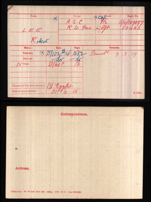 ROBERT THOMSON LEE, D.C.M., served as Cpl S/4/109897 with the Army Service Corps then as Sergeant 50463 with the 12th Bn Royal Scots Fusiliers. As a Master Baker, he was a very valuable asset in