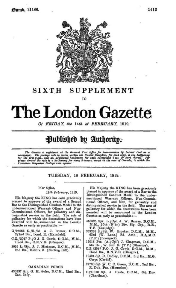 The London Gazette No 31186 of 14 February, 1919, page No 2418, shows (attached):