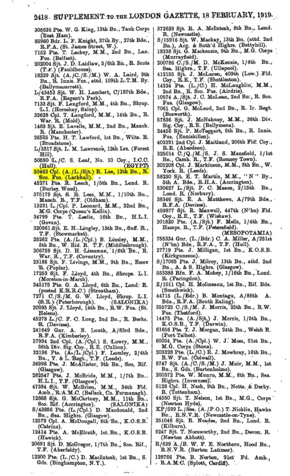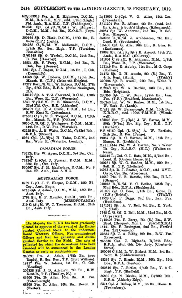 The Edinburgh Gazette No 13406 of 18 February, 1919, page No 972, shows (attached):