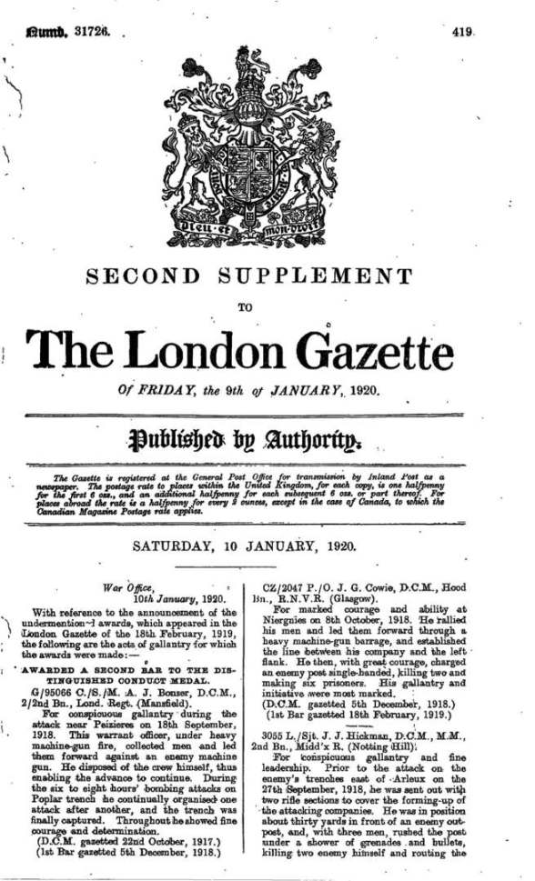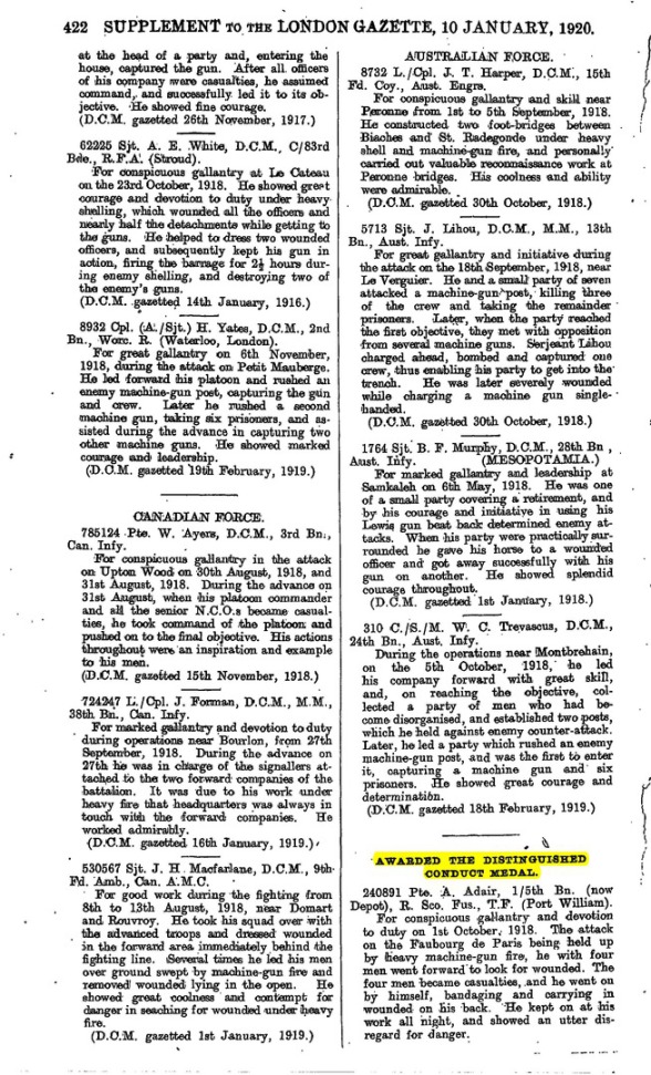 The London Gazette No 31726 of 9 January 1920, page No 445, shows the Citation (attached):