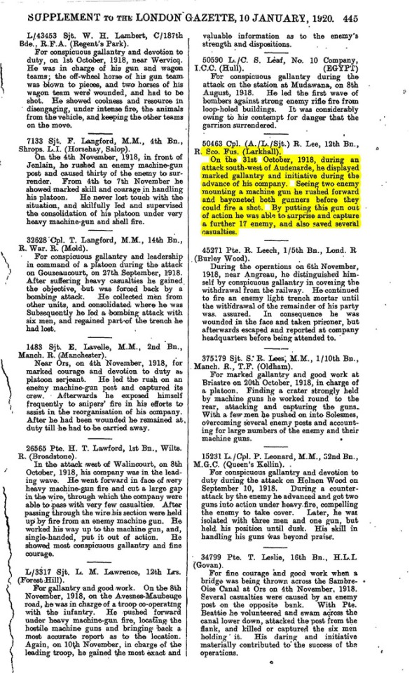 "On the 31st October, 1918, during an attack south-west of Audenarde, he displayed marked gallantry and initiative during the advance of his company. Seeing two enemy mounting a machine gun