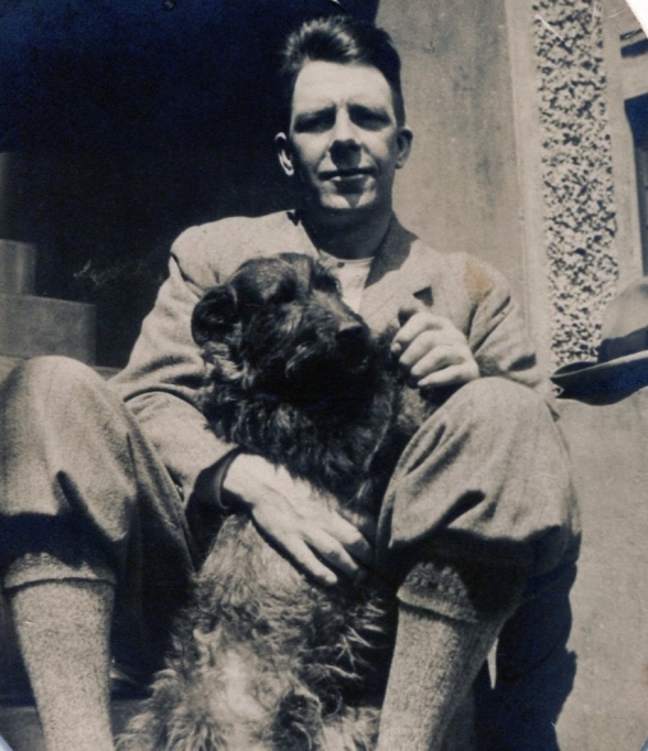 Robert Lee, DCM, sitting with his dog. Date unknown, and believed to be at the entrance to the close at Percy Street, Larkhall, though the steps are not a good clue. [The family bakery was through the close and at the rear of the building.]