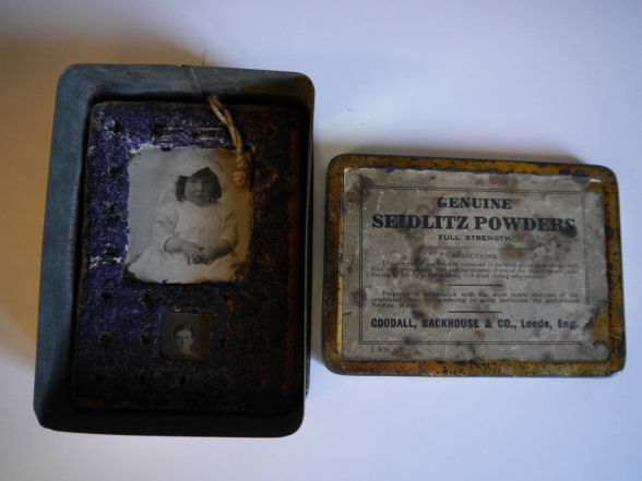 A 'Seidlitz Powders' tin, carried during the War by Robert Lee, DCM, containing a 'hard tack' biscuit with a cutout containing a photo of his daughter - Jeanie Whitefield Johnstone Stevenson Lee, born on 24th September, 1914, at 83 Miller Street, Larkhall.