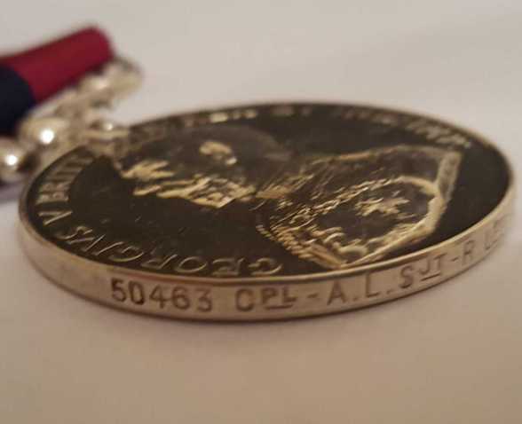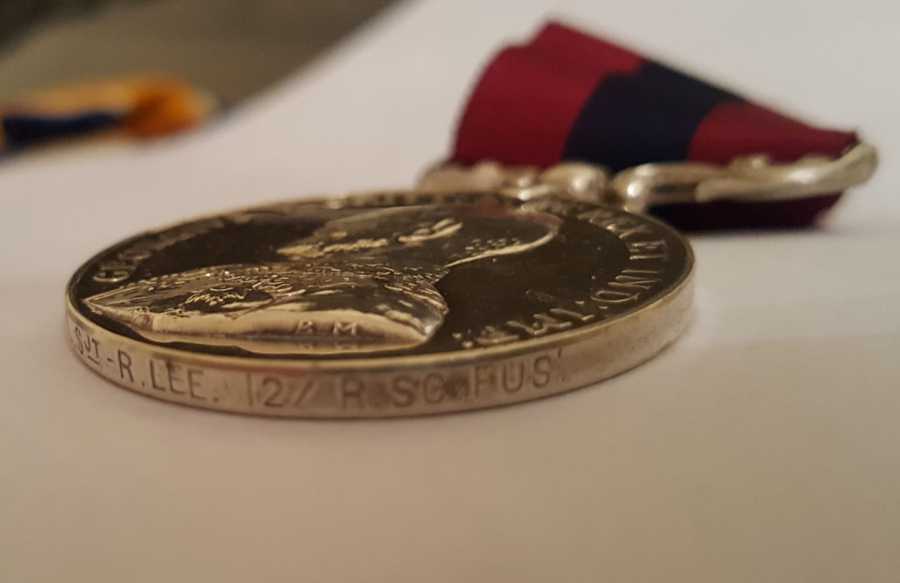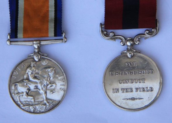 Photo of the actual Distinguished Conduct Medal (D.C.M.) on the right side, and the actual British War Medal on the left side, awarded to Sergeant ROBERT THOMSON LEE, D.C.M.