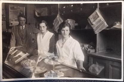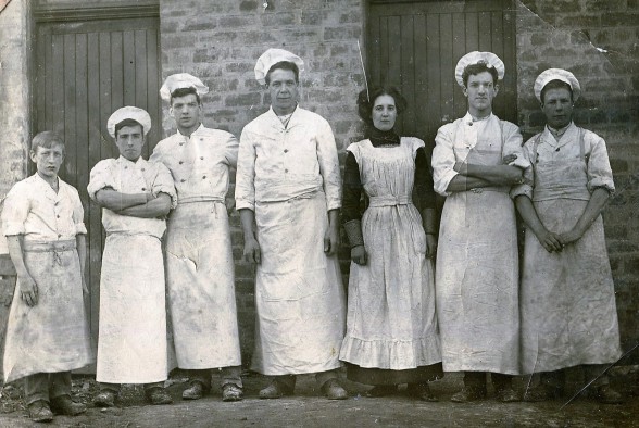 The photo was taken inside the Lee family bakery shop (Albert Bakery) in Percy Street, Larkhall. The individuals and the date are unknown, though I suspect that the gentleman is the father of Robert Lee, D.C.M..