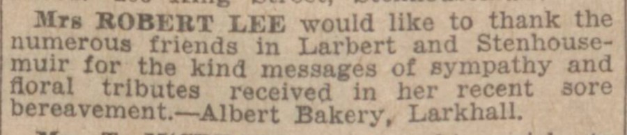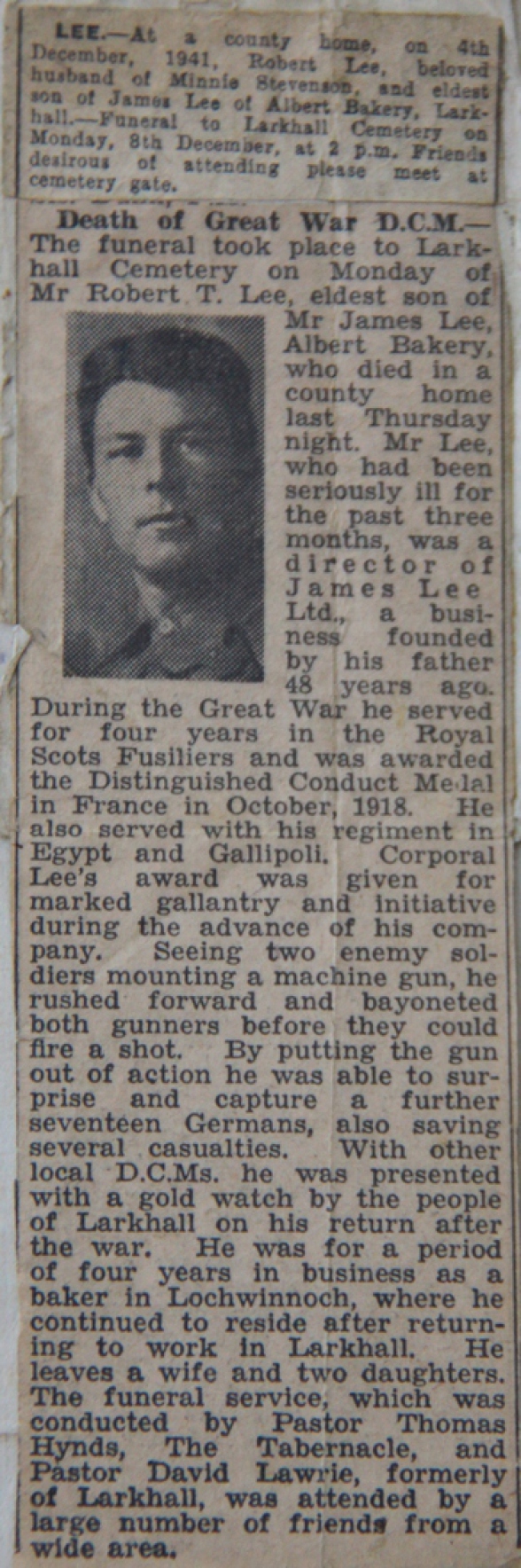 On 4th December, 1941, ROBERT THOMSON LEE, D.C.M., a baker, age 46, husband of Minnie Stevenson or LEE, died in Hairmyres Hospital, East Kilbride. The death record shows his address as 41 Church Street, Lochwinnoch.