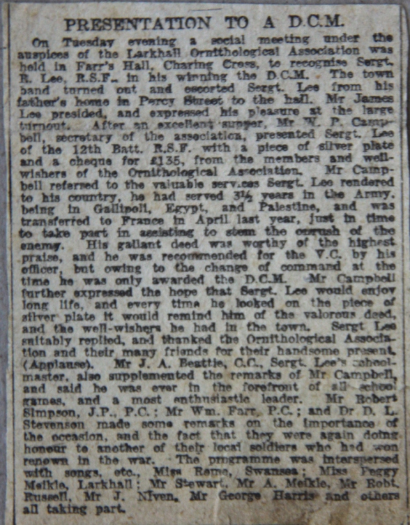On Tuesday evening a special meeting under the auspices of the Larkhall Ornithological Association was held in Farr's Hall, Charing Cross, to recognise Sergt. R. Lee, R.S.F., in his winning the