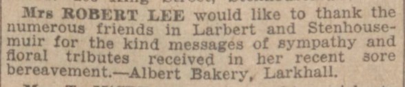On 24th May, 1956, Minnie Stevenson or LEE (ROBERT THOMSON LEE's wife), age 61, died at Glen Avenue, Larkhall.