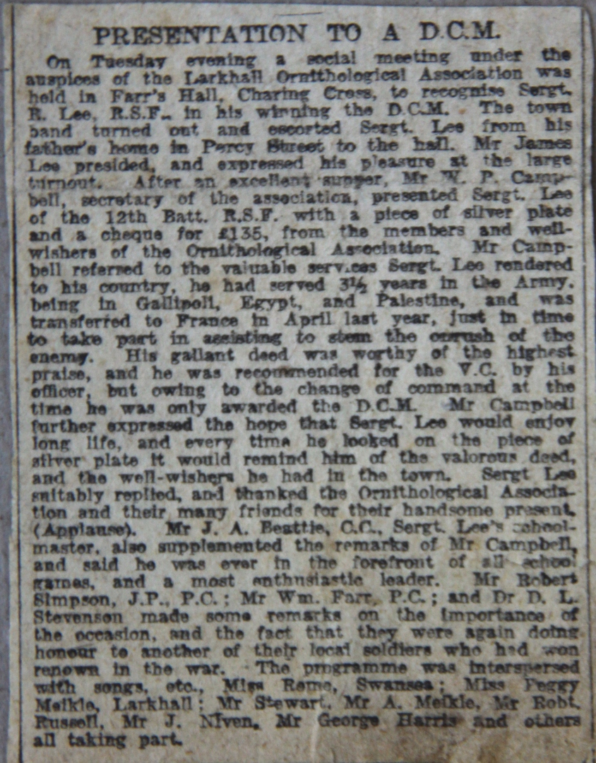 "The Executive Committee of the Larkhall War Committee met in the Drill Hall, Larkhall, last night to honour recipients of the Distinguished Conduct Medal. County Councillor Lambie, J.P., presided,