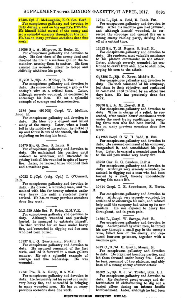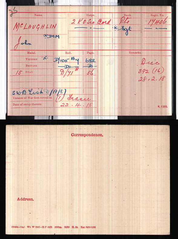 JOHN McLAUGHLIN, D.C.M., joined the K.O.S.Bs as Pte 17406, and went to France on 22nd April, 1915.
