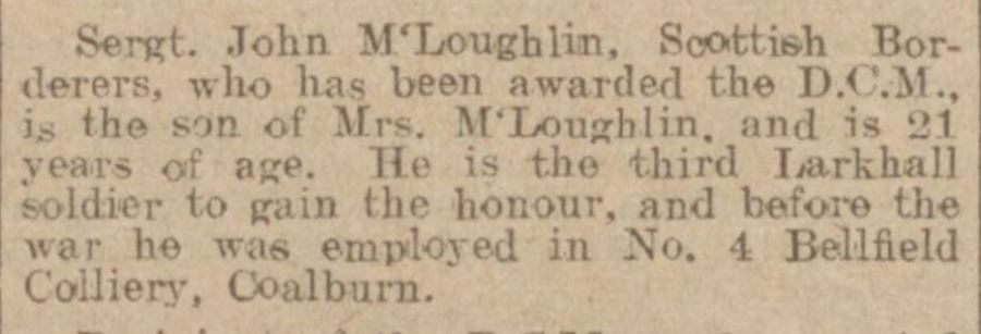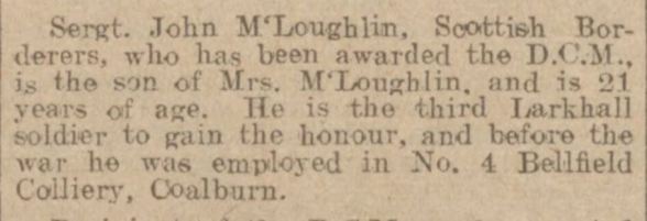 "Sergt. John McLoughlin [sic], Scottish Borderers, who has been awarded the D.C.M., is the son of Mrs. McLoughlin (sic), and is 21 years of age. He is the third Larkhall soldier to gain the honour,