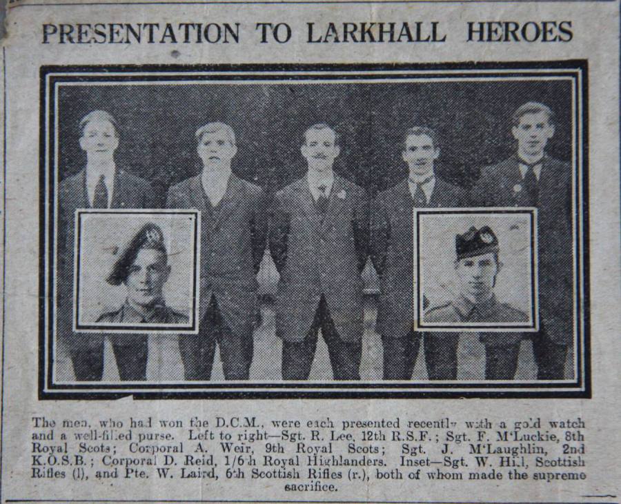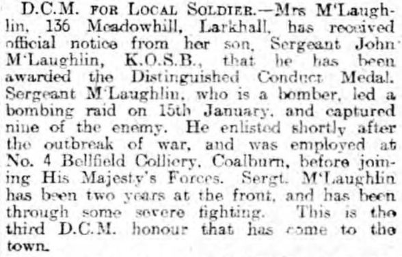 "D.C.M. for Local Soldier - Mrs McLaughlin, 136 Meadowhill, Larkhall, has received official notice from her son, Sergeant John McLaughlin, K.O.S.B., that he has been awarded the Distinguished Conduct