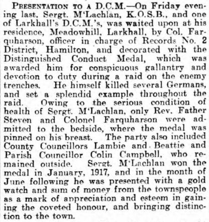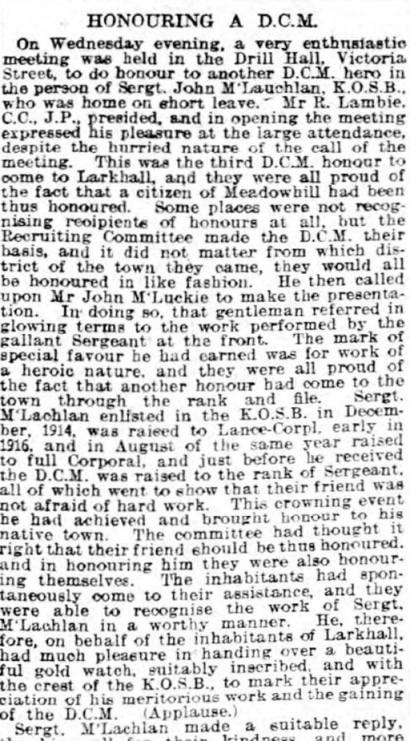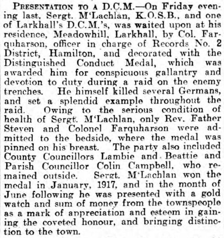 "PRESENTATION TO A D.C.M. - On Friday evening last, Sergt. McLachlan (sic), K.O.S.B., and one of Larkhall's D.C.M.'s, was waited upon at his residence, Meadowhill, Larkhall, by Col. Farquharson,