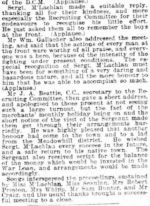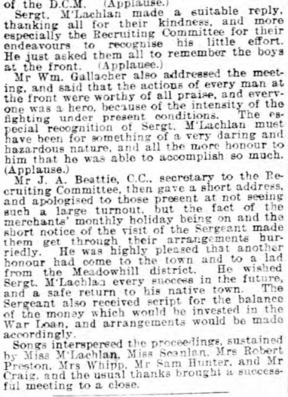 the Meadowhill district.He wished Sergt. McLachlan (sic) every success in the future, and a safe return to his native town. The Sergeant also received script for the balance of the money which would