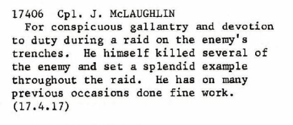 Medal. Sergeant McLaughlin, who is a bomber, led a bombing raid on 15th January, and captured nine of the enemy. He enlisted shortly after the outbreak of war, and was employed at No. 4 Bellfield