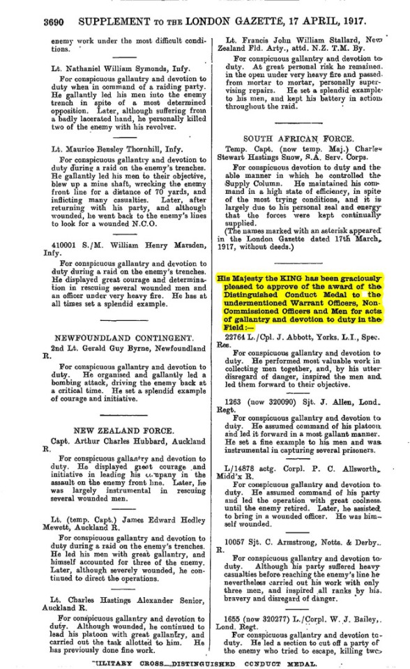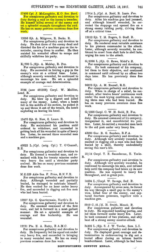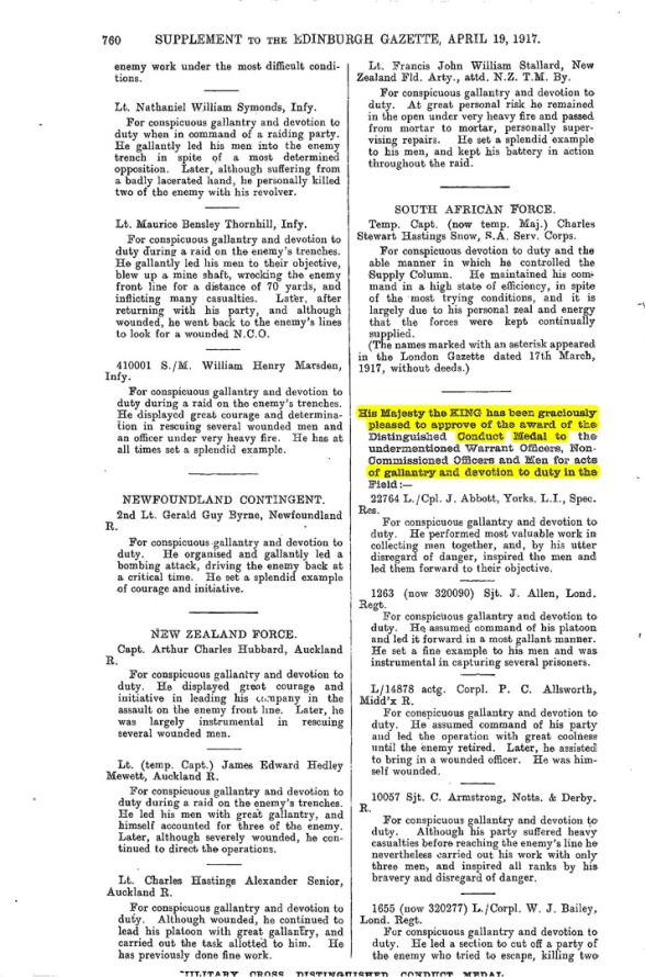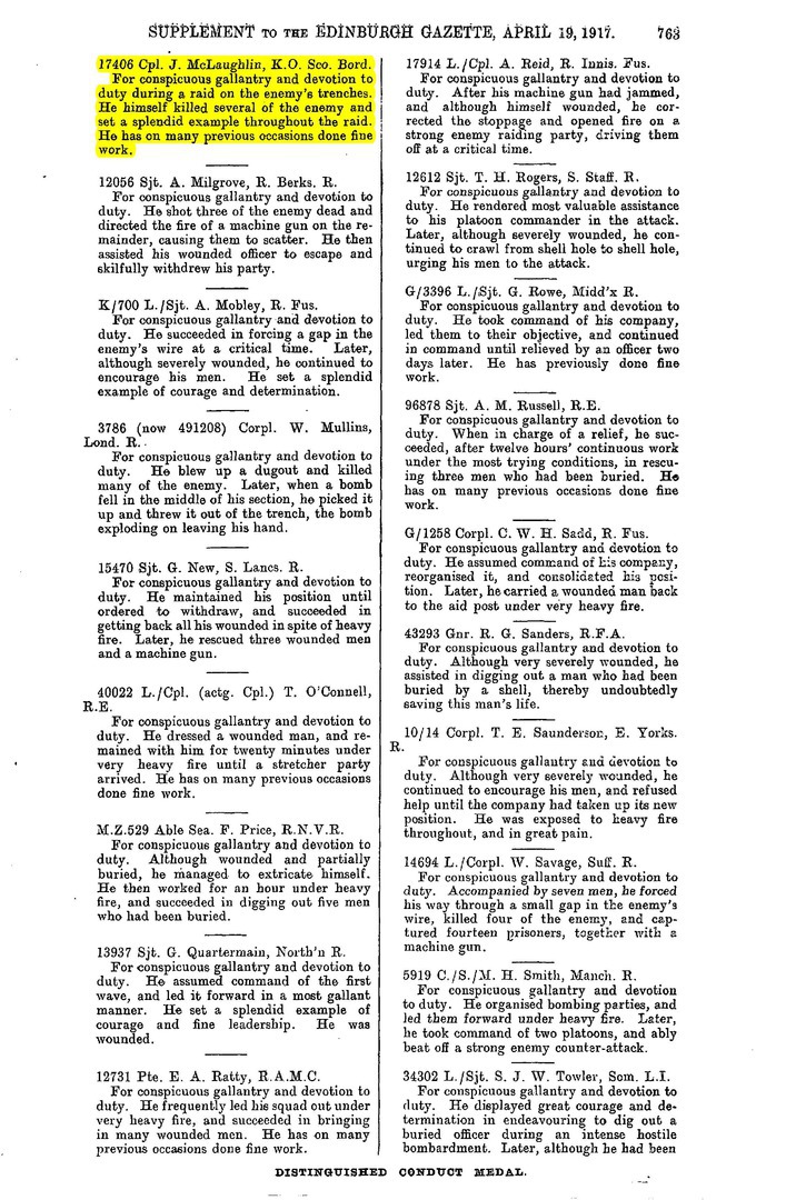 The Edinburgh Gazette No 13079 of 17 April, 1917, page No 745, (attached).