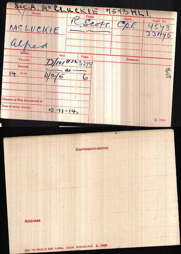 The Medal Rolls Index Card (MIC) for JOHN McLUCKIE shows that he was awarded The Victory Medal and The British War Medal. His MIC is undated, indicating that he went to France after 1915.