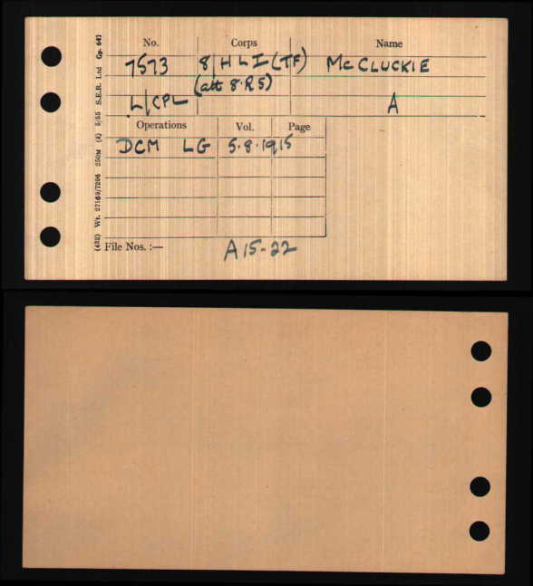 The main focus of this research is on ALFRED McLUCKIE, D.C.M., Sergeant 331175, who served in the 8th Bn The Royal Scots. He formerly served as Private 7573 in the 8th Bn Highland Light Infantry.