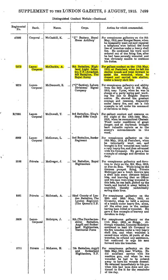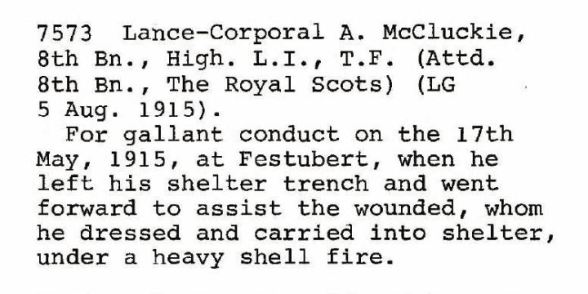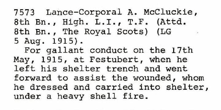 ALFRED McLUCKIE was awarded the Distinguished Conduct Medal (D.C.M.) while serving with the 8th Bn H.L.I., and attached to the 8th Royal Scots.