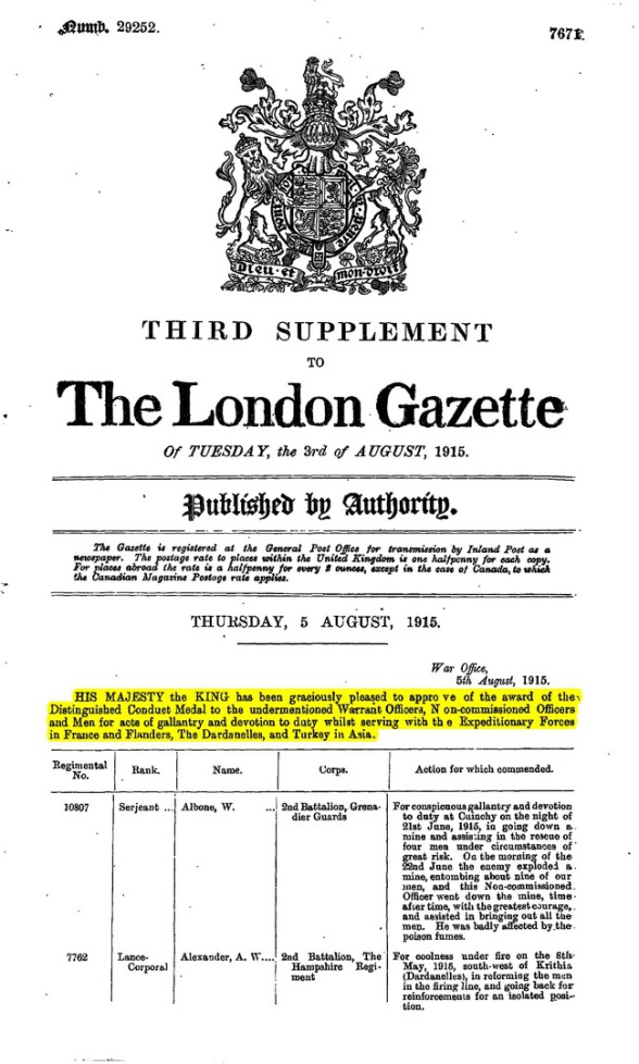 The London Gazette No 29252 of 3rd August, 1915, page No 7699, shows: