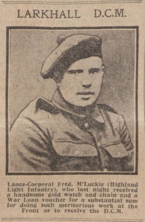 Lance-Corporal Fred McLuckie (Highland Light Infantry), who last night received a handsome gold watch and chain and a War Loan voucher for a substantial sum for doing such meritorious work at the