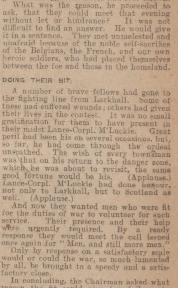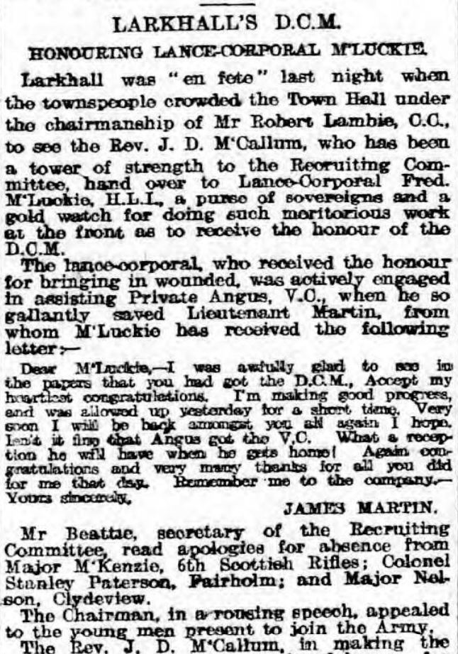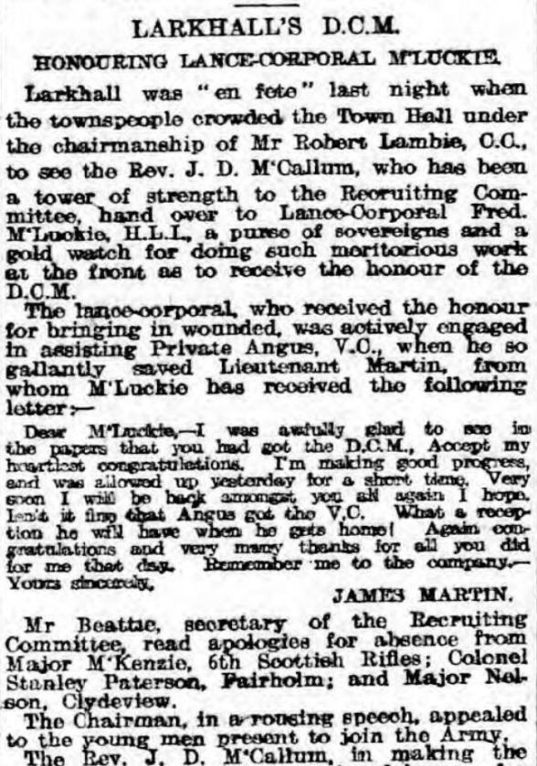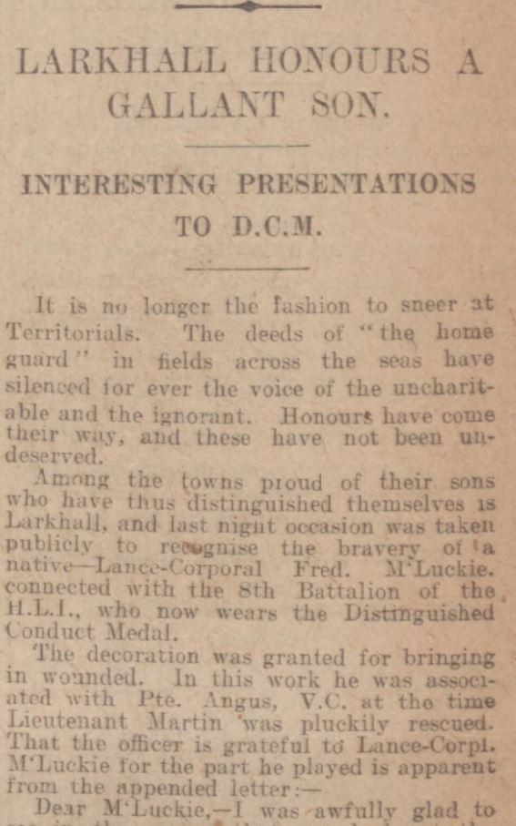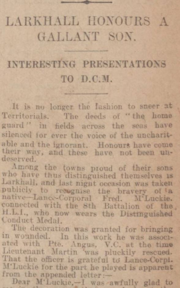 Among the towns proud of their sons who have thus distinguished themselves is Larkhall, and last night occasion was taken publicly to recognise the bravery of a native - Lance-Corporal Fred McLuckie,