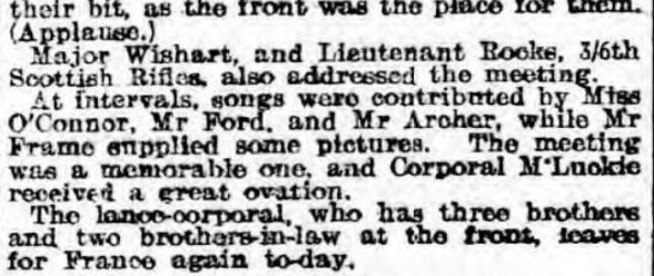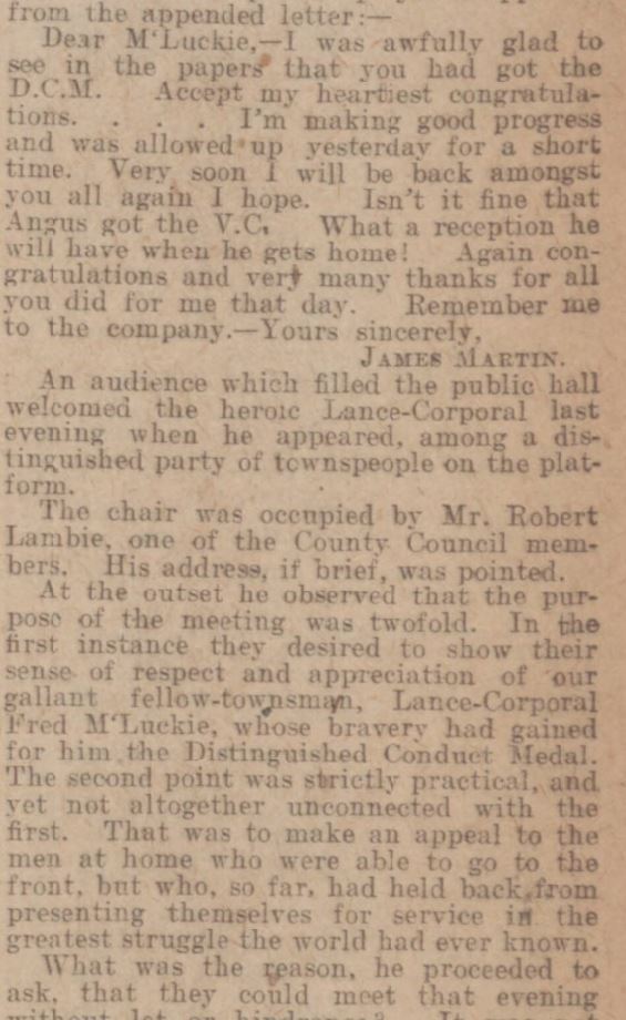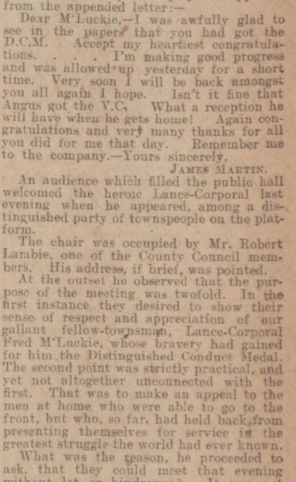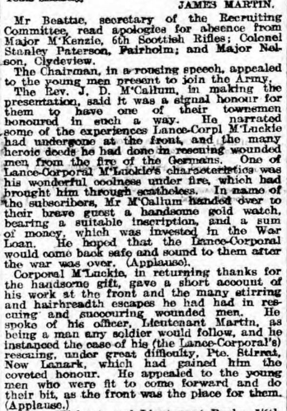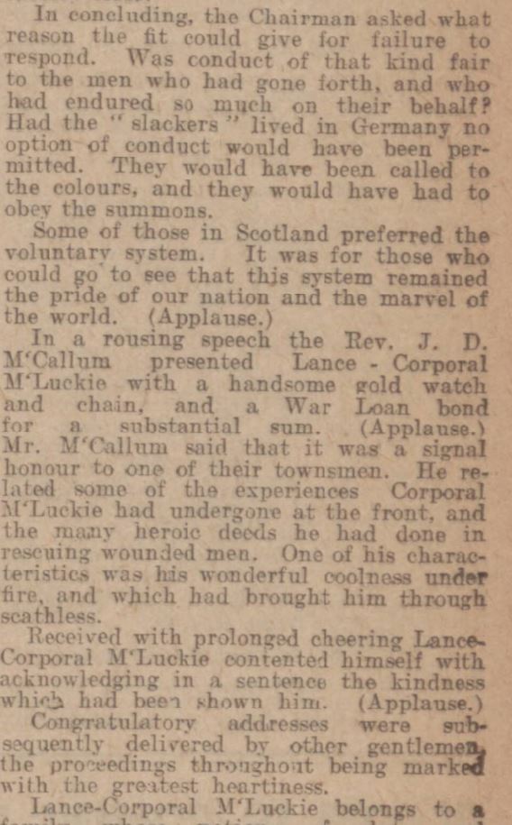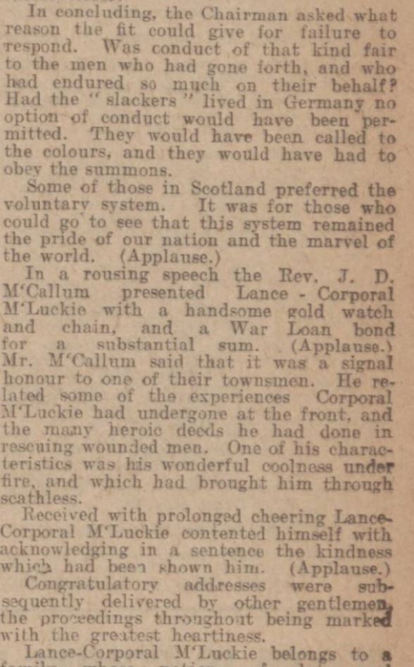 Mr McCallum said that it was a signal honour to one of their townsmen. He related some of the experiences Corporal McLuckie had undergone at the front, and the many heroic deeds he had done in