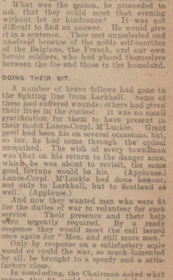Lance-Corpl. McLuckie had done honour, not only to Larkhall, but to Scotland as well. (Applause)