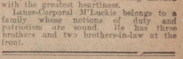 Lance-Corporal McLuckie belongs to a family whose notions of duty and patriotism are sound. He has three brothers and two brother-in-law at the front."