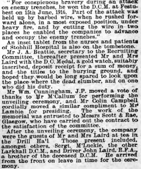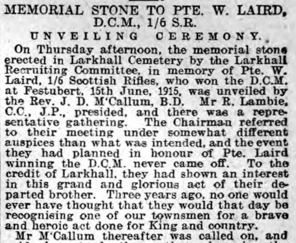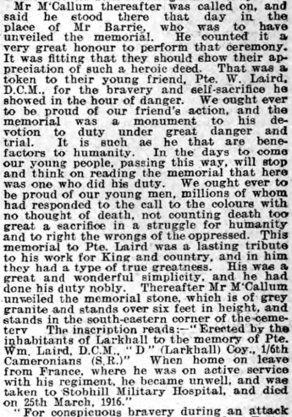 A clipping taken from The Hamilton Advertiser dated 23 December, 1916, page 5, refers to the unveiling of the Memorial Stone to Pte W. Laird, D.C.M, 1/6th Scottish Rifles.