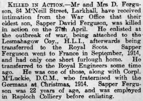 A clipping taken from The Hamilton Advertiser dated 13 May, 1916, page 6, refers to the announcement of the death of Sapper David Ferguson.