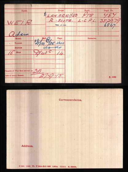 The Medal Rolls Index Card (MIC) for ADAM WEIR, DCM, MM, shows that he was awarded The 1914-15 Star Medal, The Victory Medal and The British War Medal.