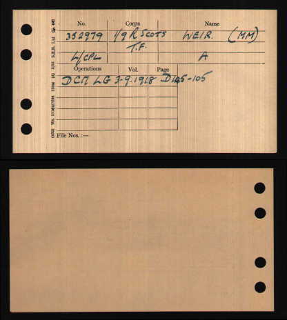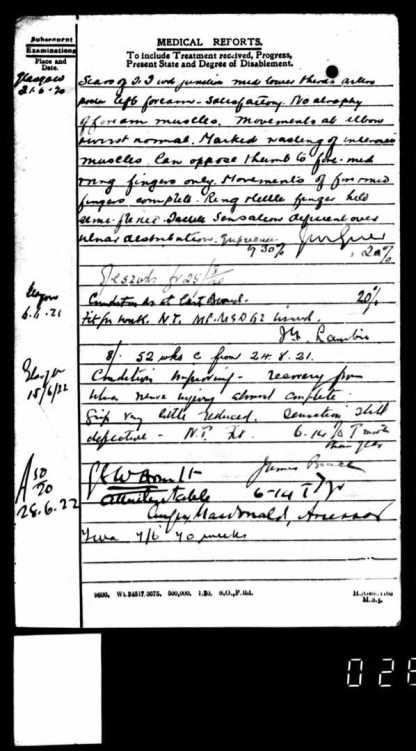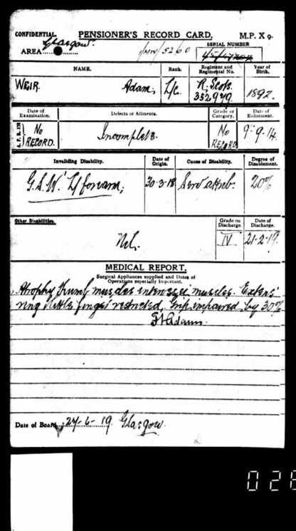 ADAM WEIR, DCM, MM, suffered a Gun Shot Wound to his left forearm on 30th March, 1918, for which he later received an Army Pension.
