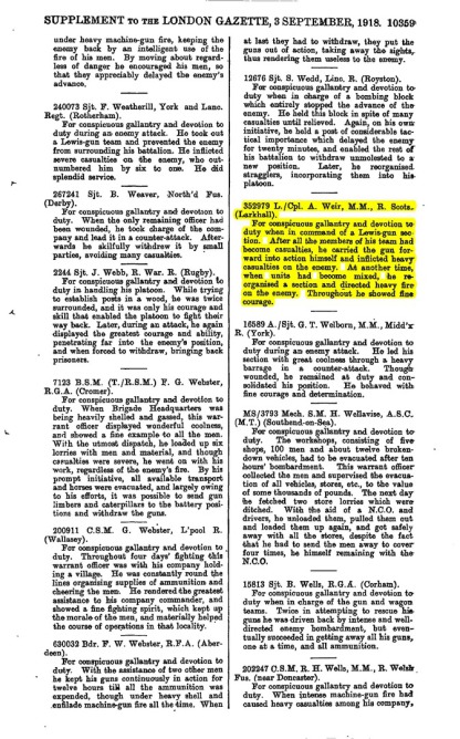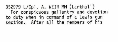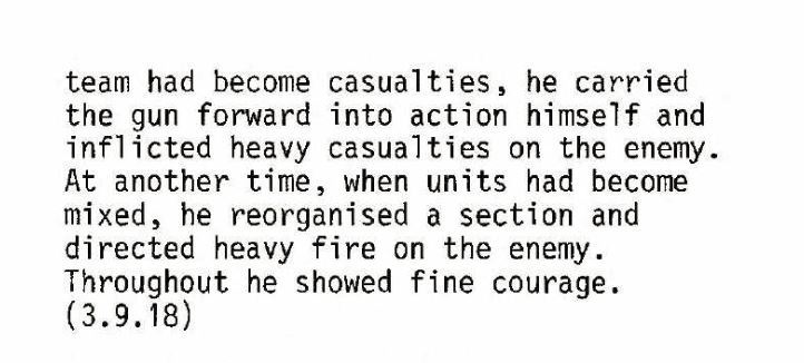 "For conspicuous gallantry and devotion to duty when in command of a Lewis gun section. After all members of his team had become casualties, he carried the gun forward into action himself and