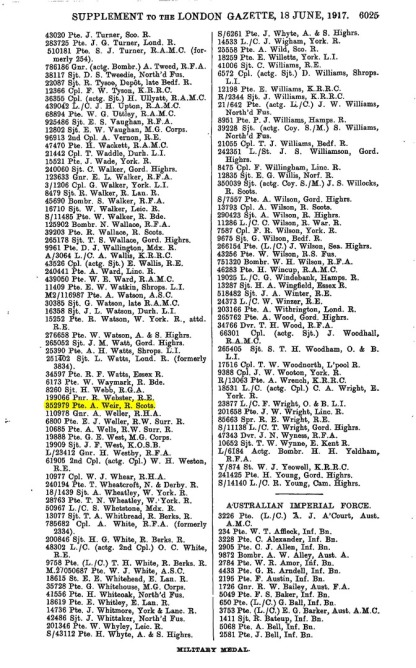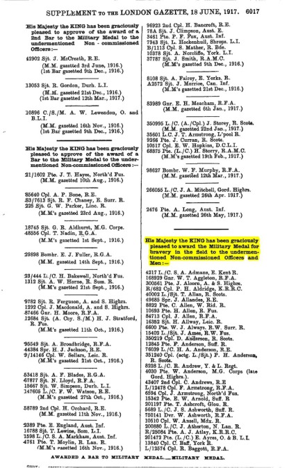 The London Gazette No 30135 of 15 June, 1917, page No 6025, shows the award of The Military Medal: