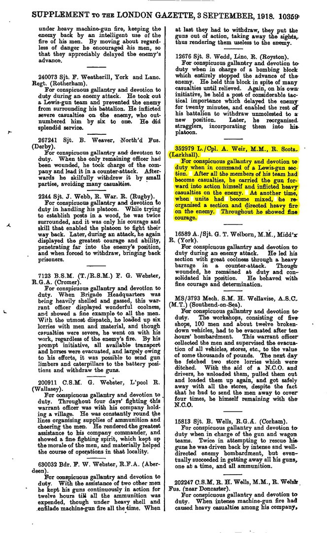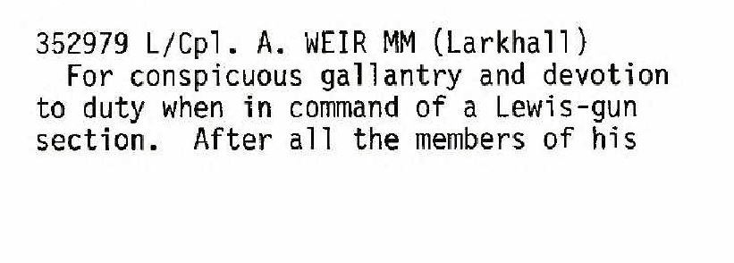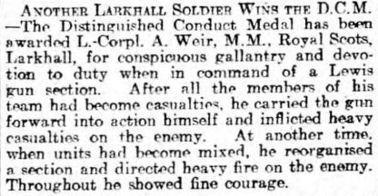 - The Distinguished Conduct Medal has been awarded to L-Corpl. A. Weir, M.M., Royal Scots, Larkhall, for conspicuous gallantry and devotion to duty when in command of a Lewis gun section. After all