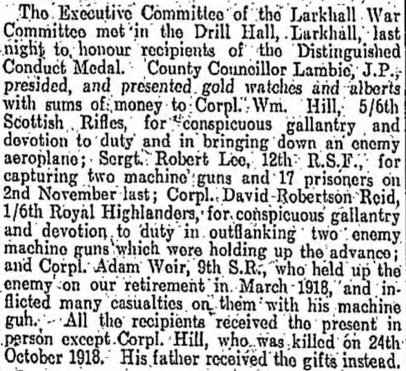 the attached newspaper clipping names 'Corpl Wm Hill; Sergt Robert Lee; Corpl David Robertson Reid; and Corpl Adam Weir' who were recipients of the Distinguished Conduct Medal