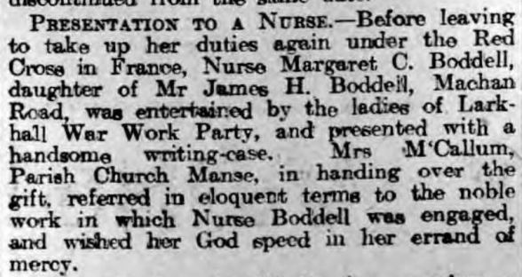 "PRESENTATION TO A NURSE - Before leaving to take up her duties again under the Red Cross in France, Nurse Margaret C. Boddell, daughter of Mr James H. Boddell, Machan Road, was entertained by the