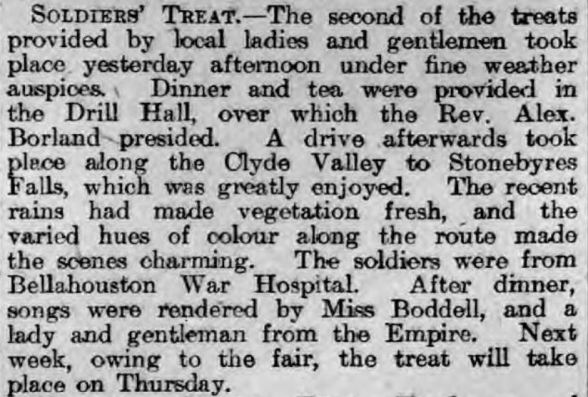 hues of colour along the route made scenes charming. The soldiers were from Bellahouston War Hospital. After dinner, songs were rendered by Miss Boddell, and a lady and gentleman from the Empire.