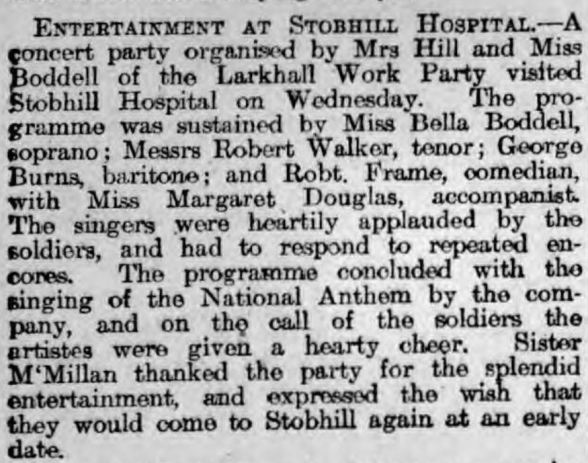 From newspaper articles in The Hamilton Advertiser, Miss Isabell Boddell was a well-known soprano singer, and she took part in many concerts to support soldiers home on leave or recuperating from the war.