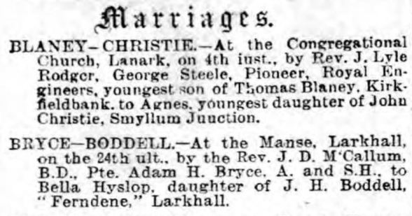 BRYCE-BODDELL - At the Manse, Larkhall, on the 24th ult., by the Rev. J. D. McCallum, B.D., Pte Adam H. Bryce, A. and S.H., to Bella Hyslop, daughter of J. H. Boddell, "Ferndene", Larkhall."