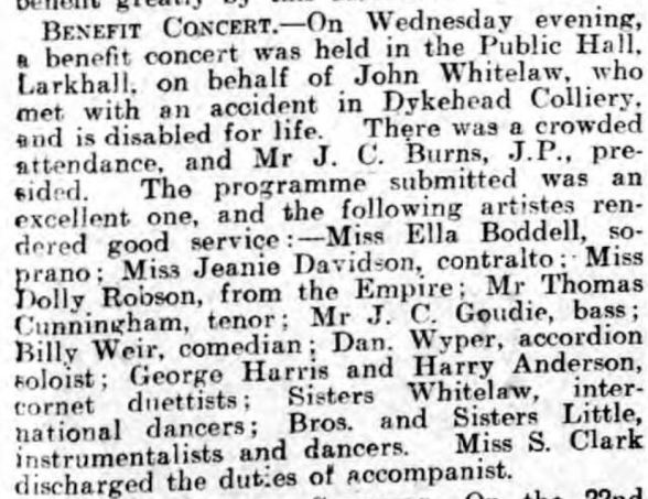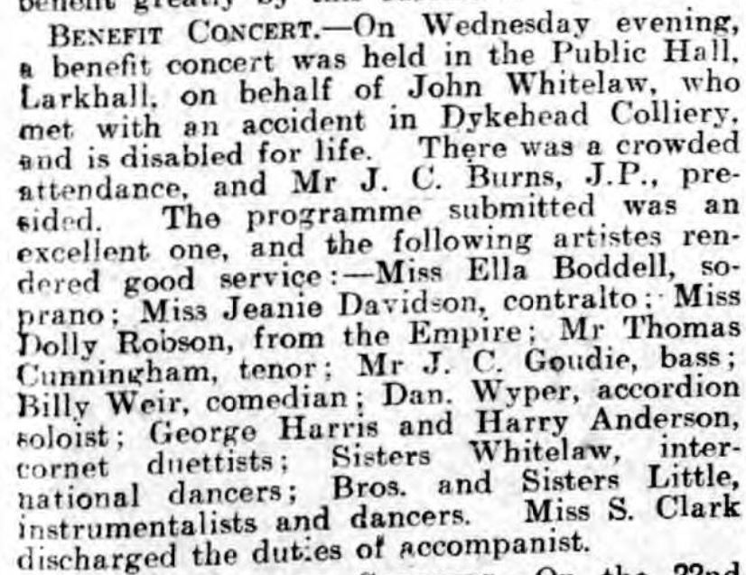 "BENEFIT CONCERT - On Wednesday evening, a benefit concert was held in the Public Hall, Larkhall, on behalf of John Whitelaw, who met with an accident in Dykehrad Colliery, and is disabled for life.