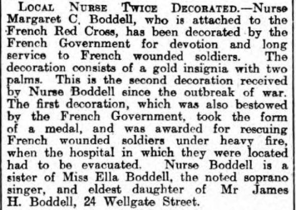 "LOCAL NURSE TWICE DECORATED - Nurse Margaret C. Boddell, who is attached to the French Red Cross, has been decorated by the French govenment for devotion and long service to French wounded soldiers.