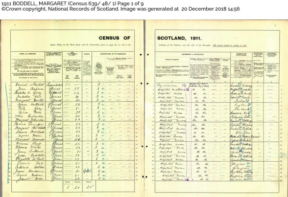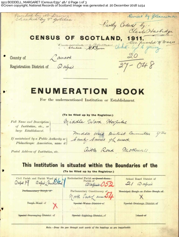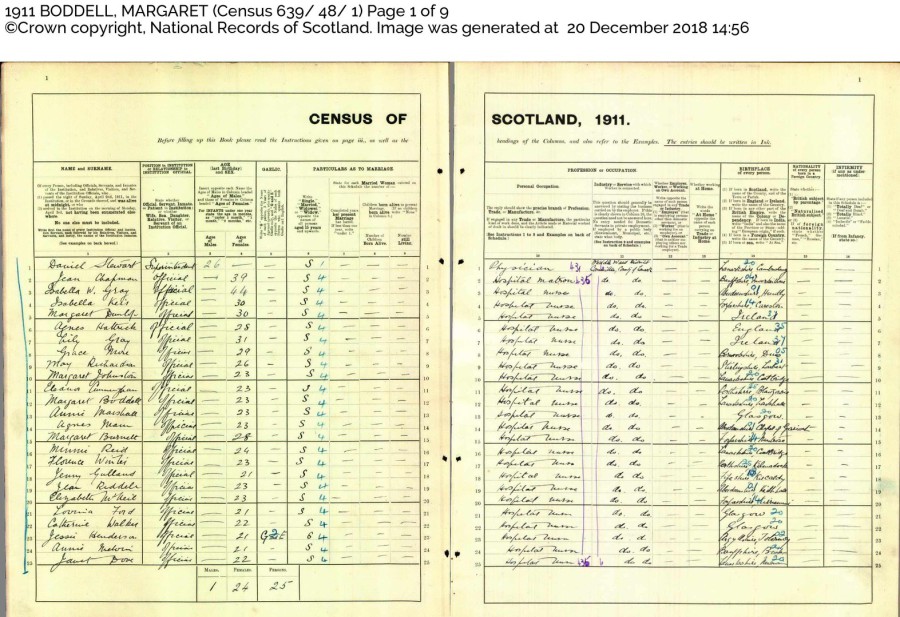1911 Census showing Margaret Boddell, age 23, born Larkhall, as a nurse at the hospital.