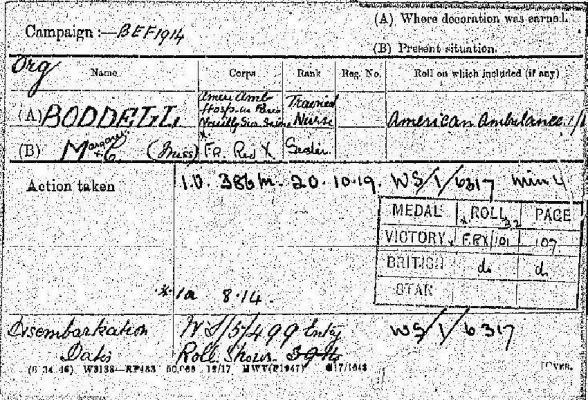 The Medal Roll for The Victory Medal and The British War Medal shows that Sister MARGARET BODDELL served in France from '8-14' to '11-18'.