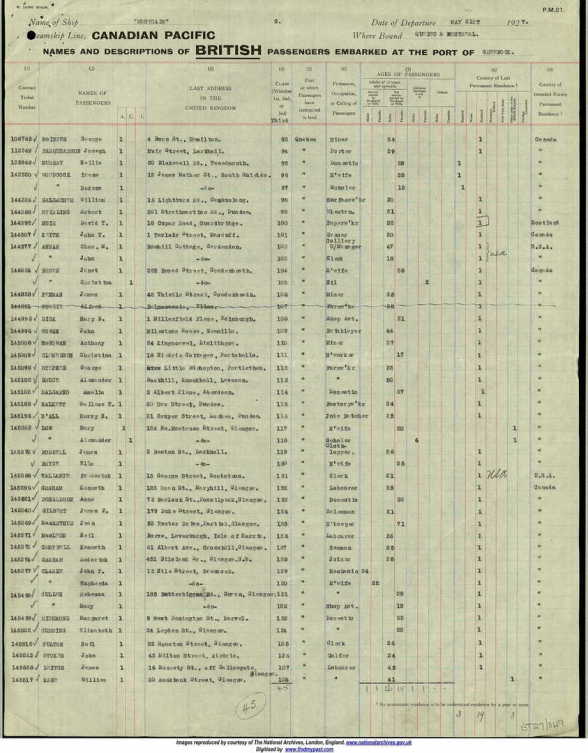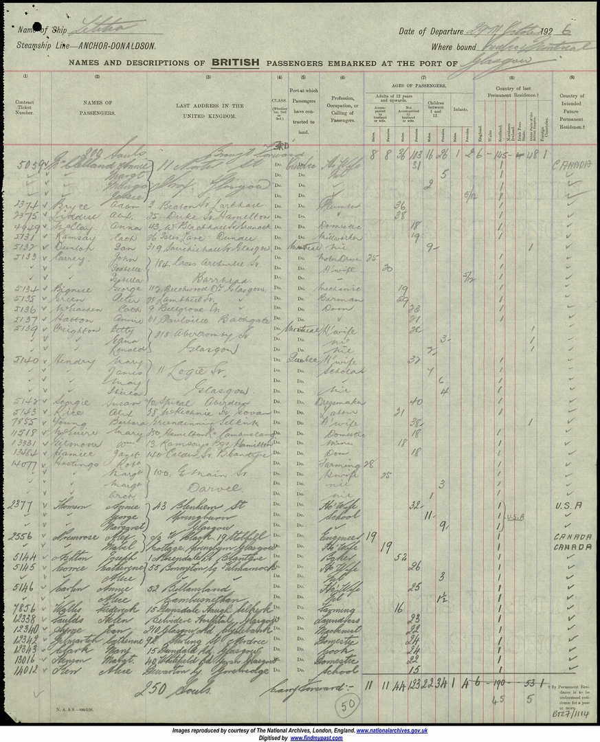 On 26th October, 1926, Adam Bryce, 3 Beaton Street, Larkhall, age 36, a plumber, left Glasgow aboard the ship Letitia, bound for Quebec, Montreal, Canada.