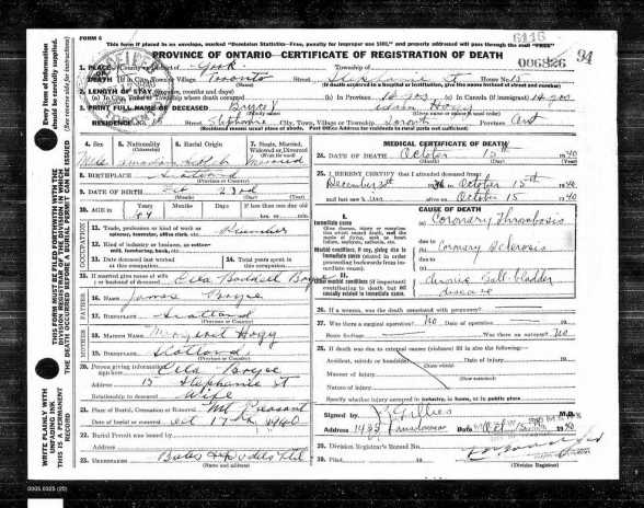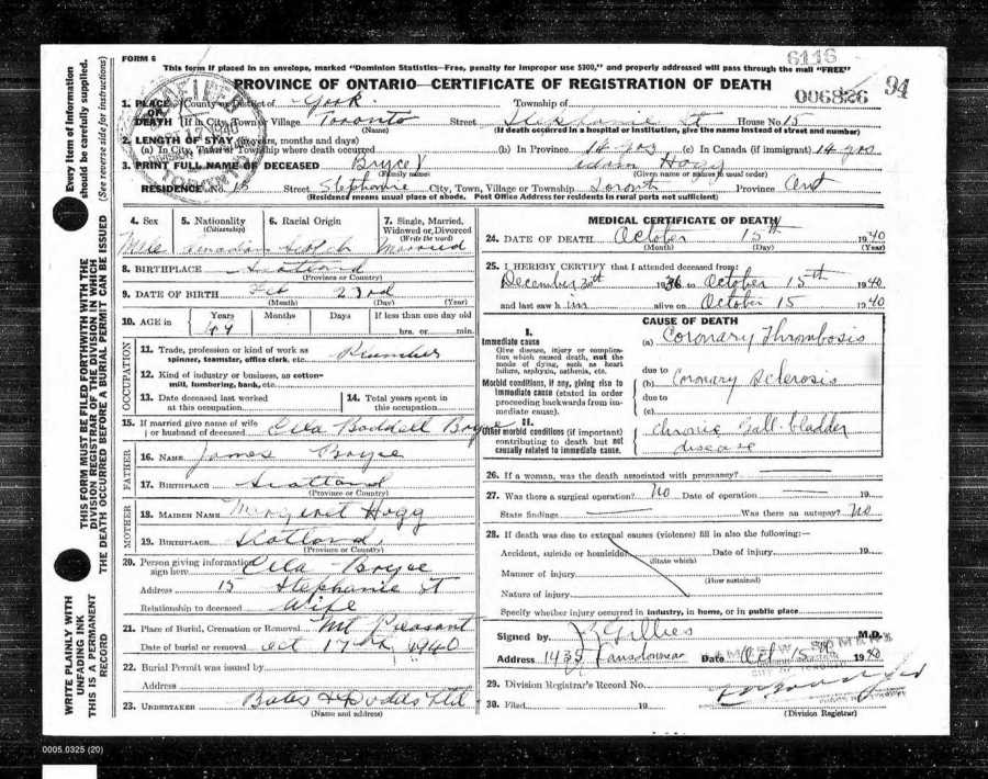 On 15th October, 1940, Adam Hogg Bryce, a plumber, age 49, husband of Ella Boddell or Bryce, died at 15 Stephanie Street, Toronto, Canada. The cause of death was Coronary Thrombosis due to Coronary Sclerosis and Chronic Gall-Bladder disease.