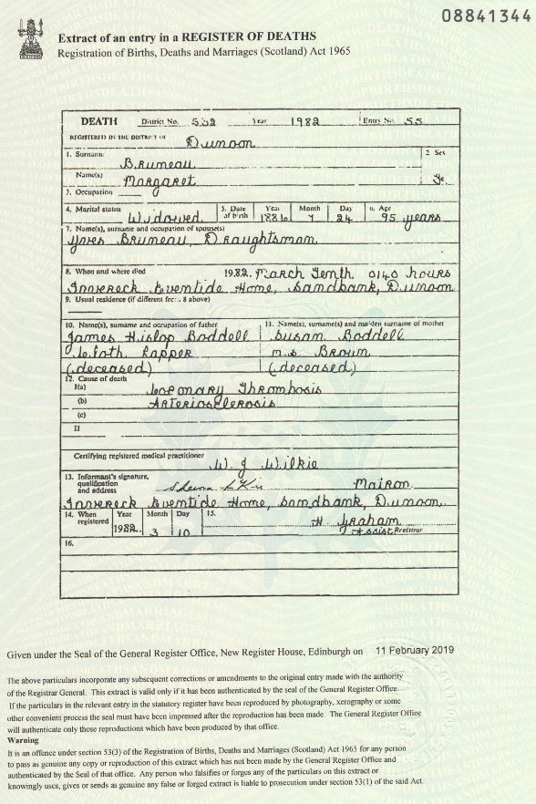 MARGARET BODDELL or BRUNEAU, age 95, died on 10th March, 1982, in Invereck Eventide Home, Sandbank, Dunoon, Argyll, Scotland. Her death record shows that she is the widow of 'Yves Bruneau, Draughtsman'.