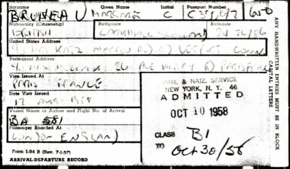 Passenger List record showing Margaret C. Bruneau arriving in New York, USA, on 10th October, 1958.