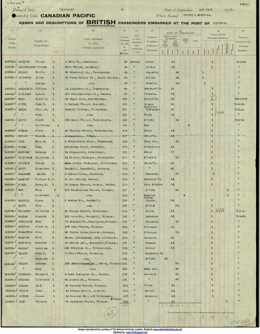 Passenger List showing James Boddell, age 56, a Cloth Lapper, of 3 Beaton Street, Larkhall, and his daughter Ella Bryce, age 35, a housewife, same address, leaving Greenock aboard the ship Montcalm, bound for Canada, on 21st May, 1927.
